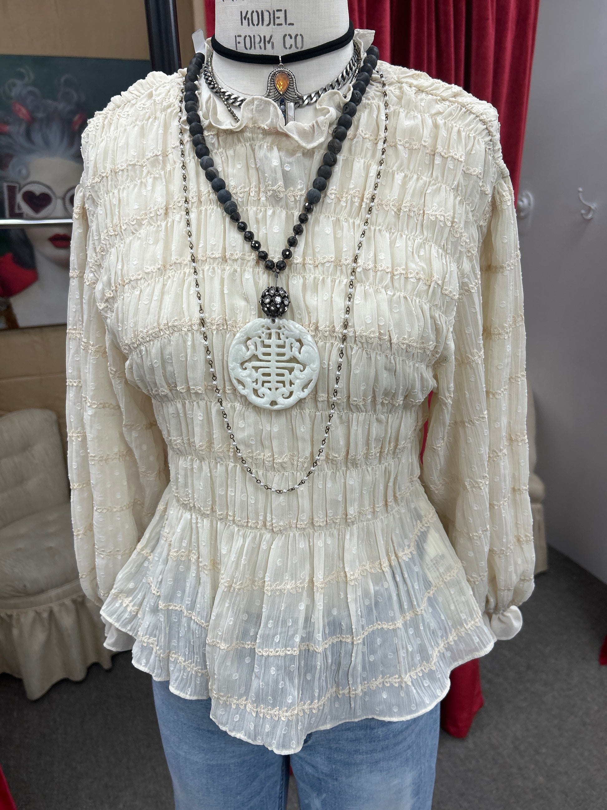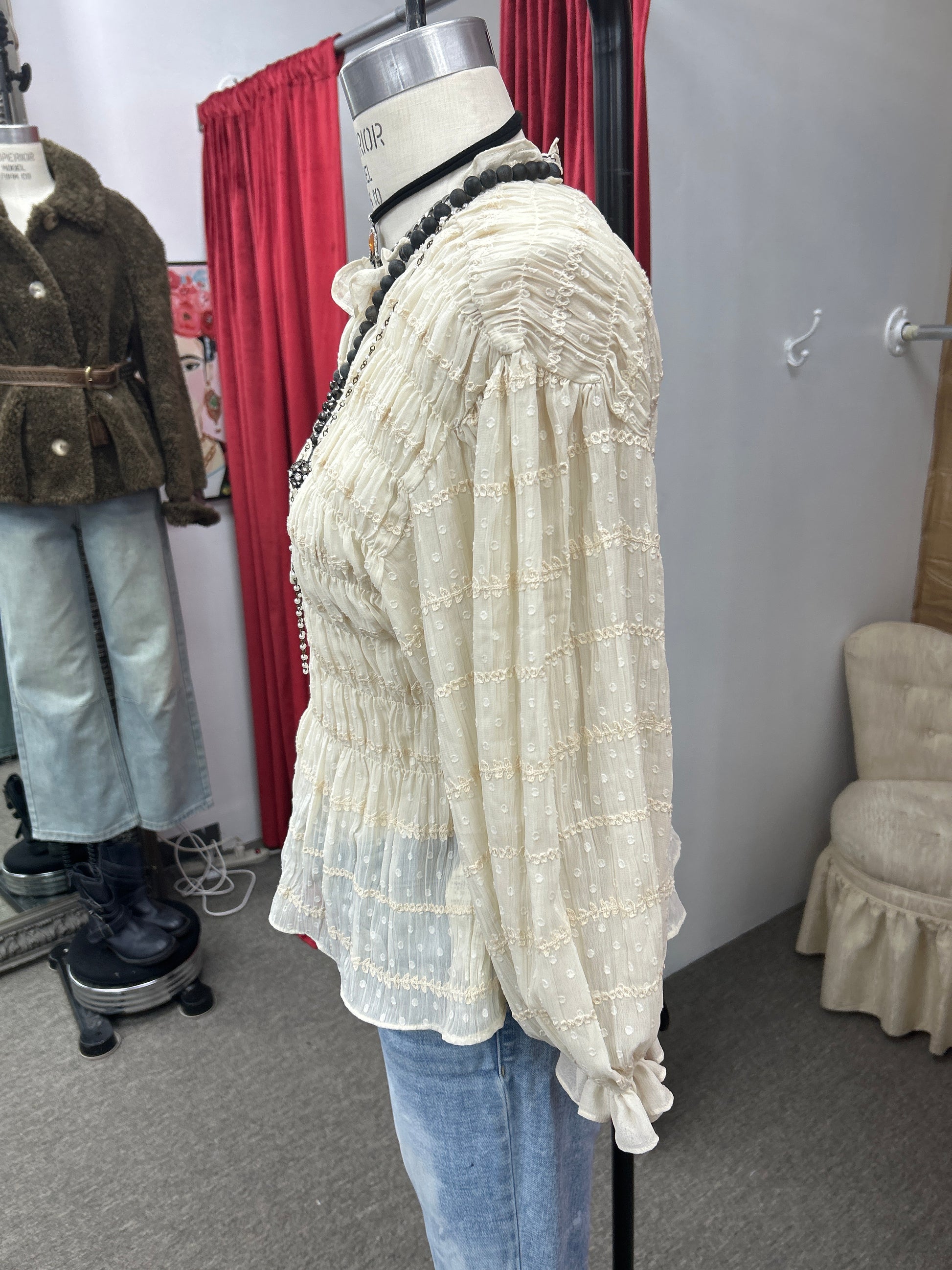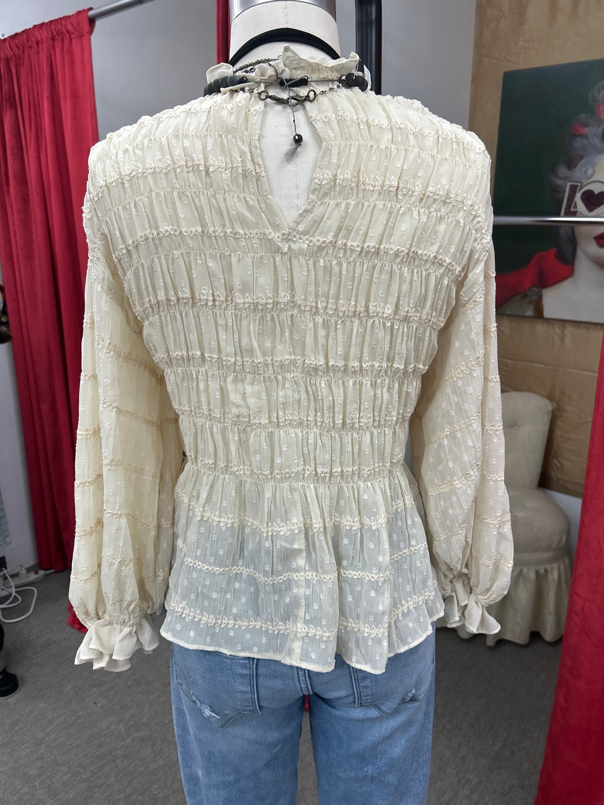 Victorian shirred blouse very feminine and pretty size small $98 shown with skinny wash bell bottom jeans